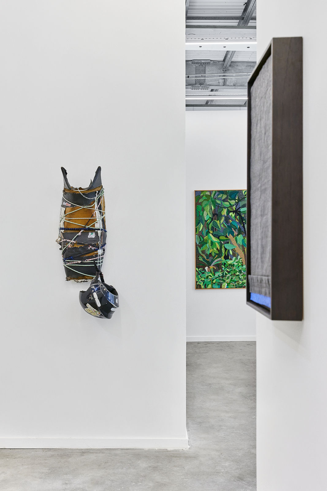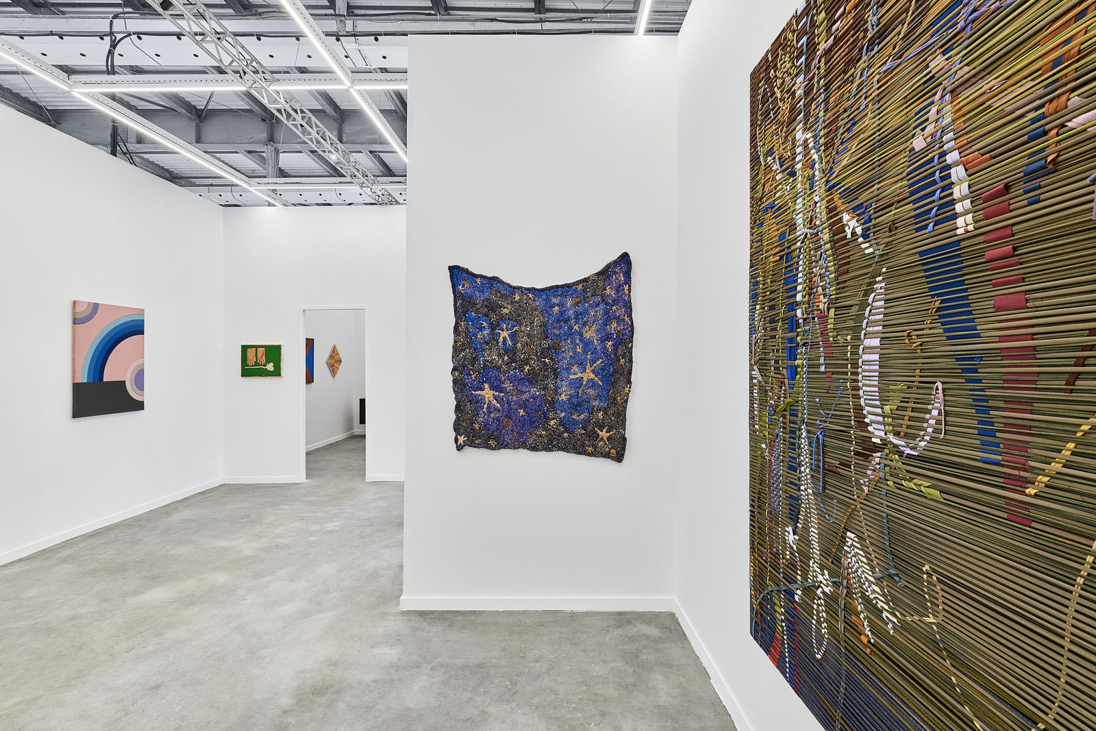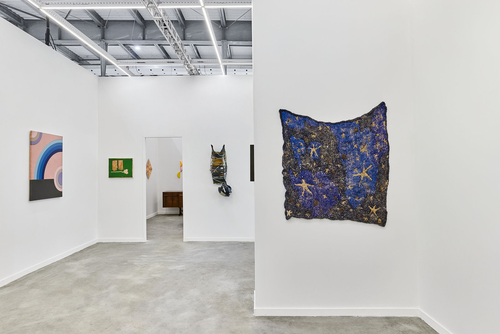 Para esta edição, o estande da Galatea apresenta um recorte que evidencia diálogos intergeracionais. Entre eles, destacam-se as correspondências entre 4 Freie in 4 Gebundenen Gruppen (1958), de Max Bill, e os blocos de cor geométricos que aparecem tanto nos recortes de lona da série Anotações (2025), de Allan Weber, quanto nas superfícies tensionadas de lycra que estruturam as pinturas sólidas de Dani Cavalier. Já a pintura de Arthur Palhano, marcada por camadas cromáticas e figuras de caráter lúdico, encontra ecos no trabalho vibrante de Francisco Galeno, que por sua vez dialoga com as raízes geométricas e populares exploradas por Alfredo Volpi.